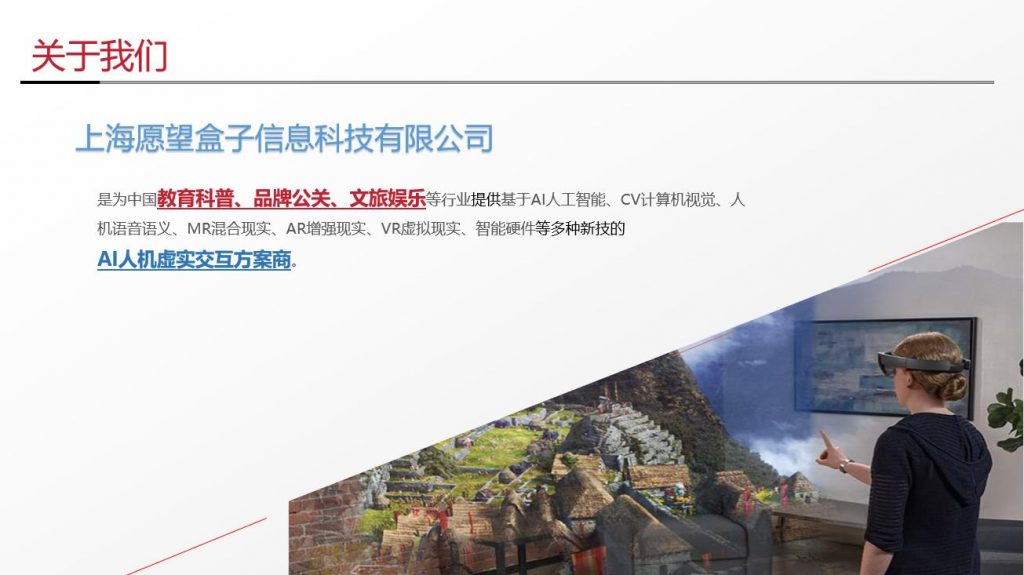 是为中国教育科普、品牌公关、文旅娱乐等行业提供基于AI人工智能、CV计算机视觉、人机语音语义、MR混合现实、AR增强现实、VR虚拟现实、智能硬件等多种新技的AI人机虚实交互方案商。